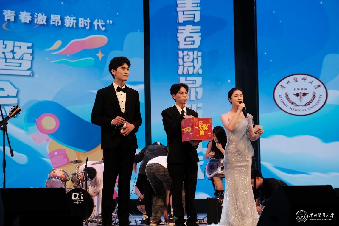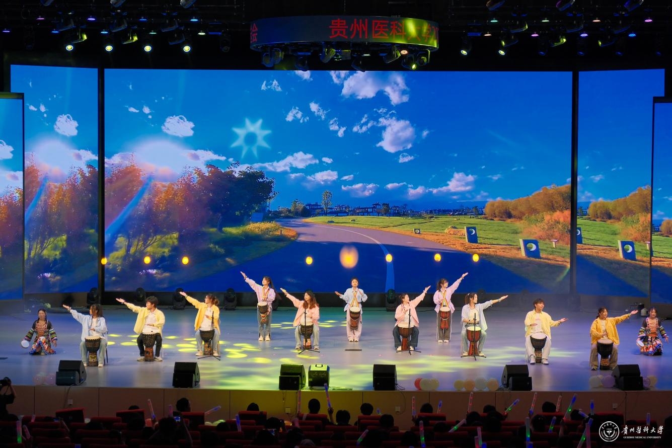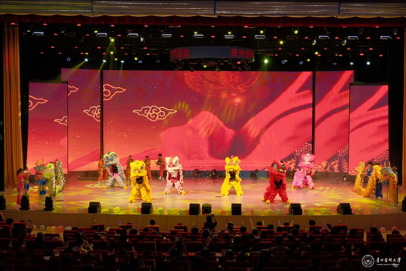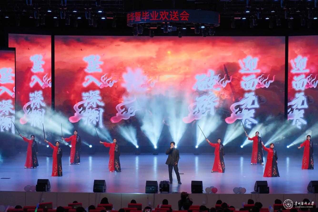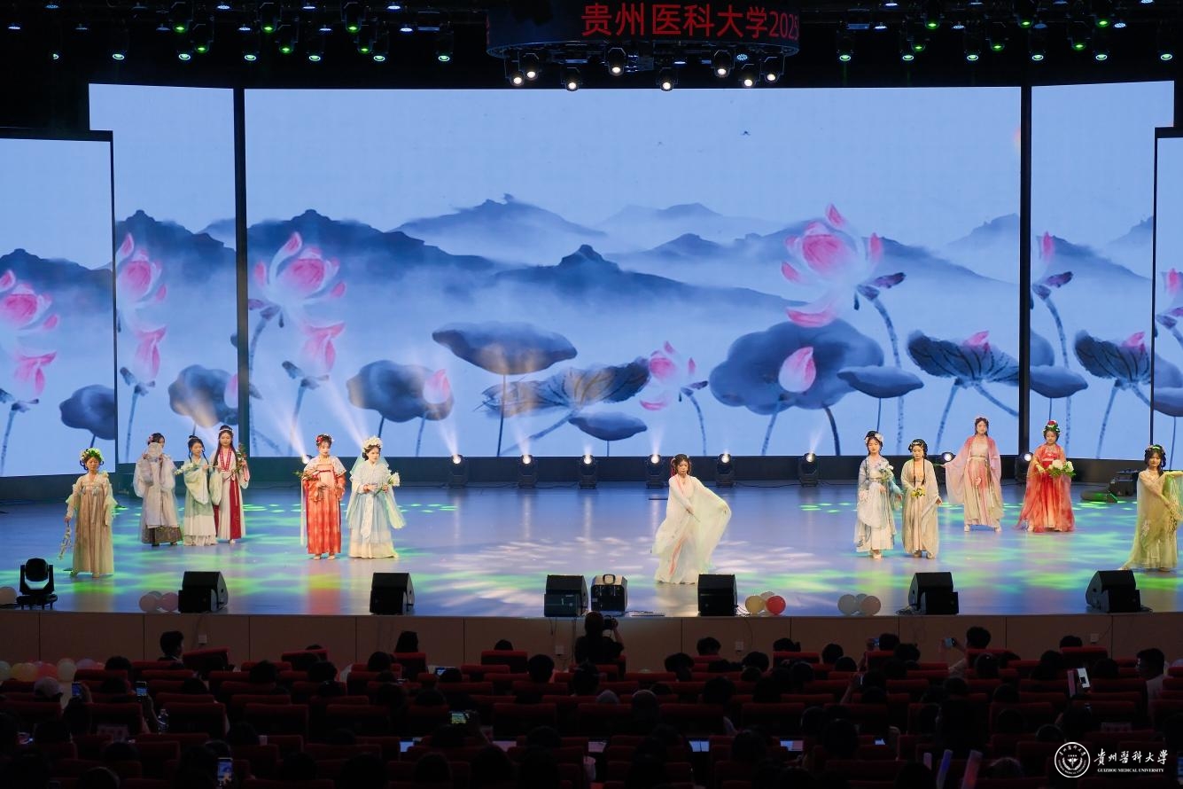 舞台之上,青春绽放。整场晚会汇聚了多元艺术形式,高潮迭起,精彩纷呈:中外学子联袂的《创意走秀》展现力与美;《龙腾狮跃》引爆传统激情;动感街舞、魔力配音、热情民族舞、燃炸说唱轮番登场;《我们的时光》浅唱离愁,《不熄》致敬“她力量”,活力二次元舞动次元壁;东西方韵律在《China X》奇妙共鸣;华服之美于《花神颂》中优雅绽放;深情朗诵《红丝带》传递责任;群舞《美丽中国》绘就盛世画卷。每一个节目都凝聚着学生社团的智慧与热情,为毕业生献上了一场视听盛宴,生动诠释了贵医校园文化的蓬勃生机。