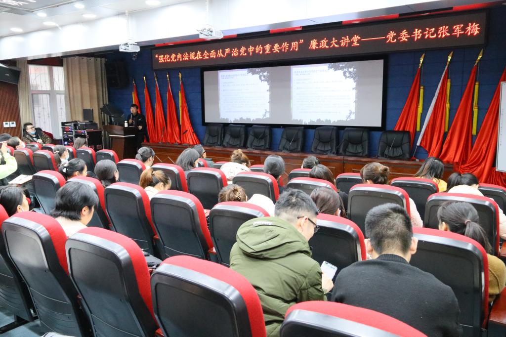 为推进廉政文化建设和廉洁教育工作,树立领导干部秉公用权、廉洁从政的价值理念,培育师生廉荣贪耻、诚实守信的道德观念,按照学校纪委“廉洁教育永远在路上”系列活动有关要求,11月23日,由口腔医(学)院纪检监察室组织开展的廉政大讲堂在学术报告厅举行。口腔医(学)院党委书记张军梅作为首届廉政大讲堂主讲人,作题为“强化党内法规在全面从严治党中的重要作用”的讲座,院党政领导、各临床医技科室、各行政职能部门主要负责人、全院副科级以上干部、各临床科室护士长以及全体教职工党员参加。院党委副书记、院长马洪主持。