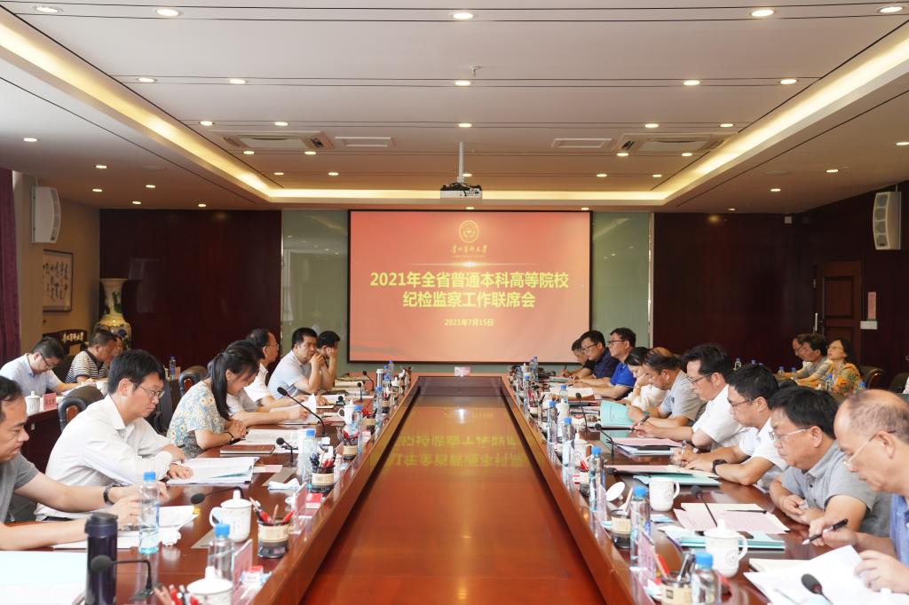 7月15日,全省普通本科高等院校纪检监察工作联席会在awc777万象城娱乐官网南校区知雨楼六楼会议室召开。省纪委常委、省监委委员、省纪委省监委秘书长、办公厅主任张洪武出席,省纪委省监委办公厅、第六监督检查室、派驻第十一纪检监察组有关负责同志,各院校纪委书记、副书记,省教育厅属高职院校纪委书记参加。会议由省纪委省监委派驻第十一纪检监察组组长李娟主持。本次会议宗旨为“交流工作做法、相互学习借鉴、深入探讨研究、提升工作质量”。