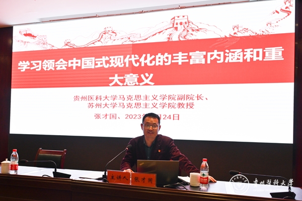 张才国以《学习领会中国式现代化的丰富内涵和重大意义》为题,从推进中国式现代化要深刻把握中国式现代化的科学内涵和本质要求、要始终坚持将高质量发展作为实现目标的“金钥匙”、要始终保持新时代踔厉奋发勇毅前行的精神状态三个方面作专题辅导报告。