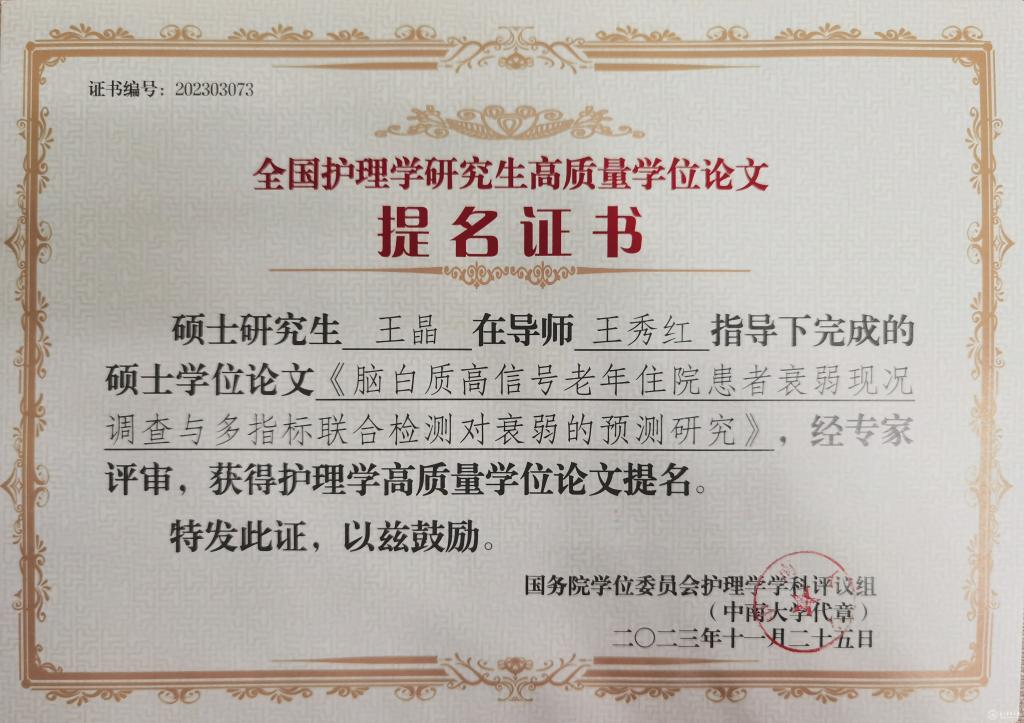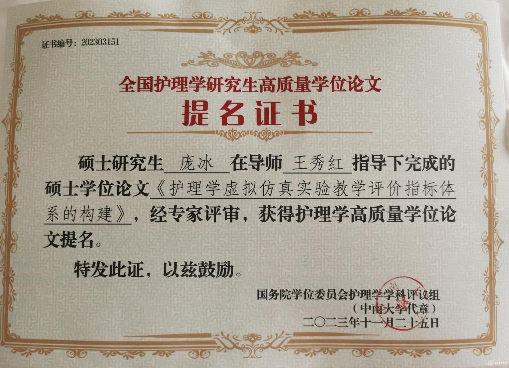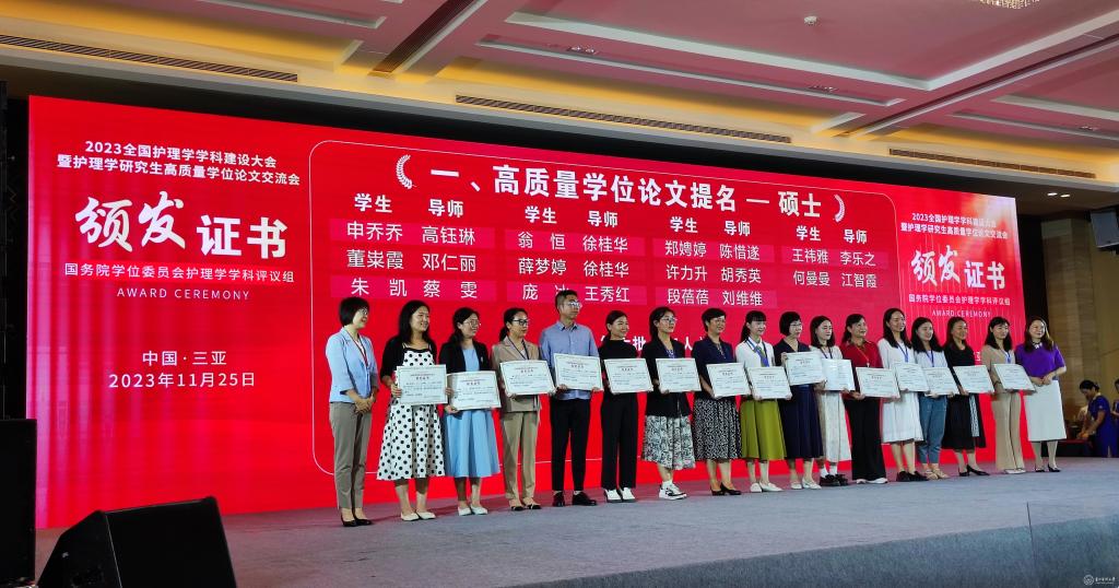 会议公布了前期由教育部护理学学科评议组开展的“高质量学位论文评选工作”情况及结果。来自全国70余所院校、2020届到2023届232篇博士硕士优秀论文进入评选目录。由万象城官网研究生导师王秀红指导的护理学院2021届护理学学硕研究生王晶、2023届护理学学硕研究生庞冰的学位论文获评高质量学位论文提名奖。