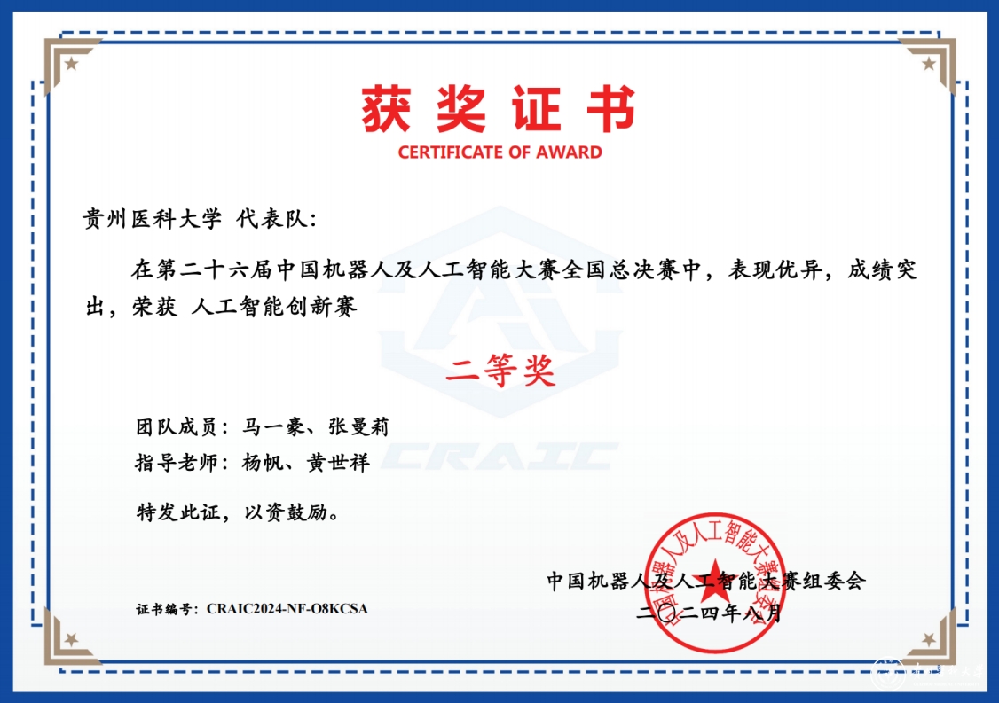 万象城官网教务处组织推荐的生物与工程学院(健康医药现代产业学院)生物医学工程专业团队(学生:马一豪、张曼莉;指导教师:杨帆、黄世祥)首次参与该项赛事,并在人工智能创新赛组荣获全国二等奖。