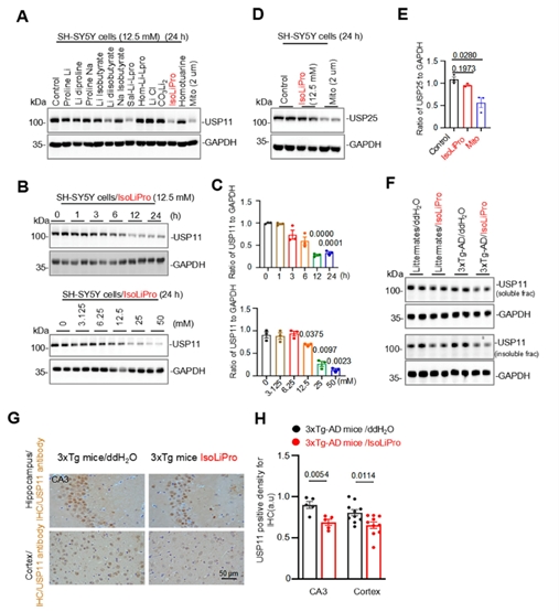 图2 IsoLiPro markedly decreases USP11 protein level in SH-SY5Y cells and the mice brain