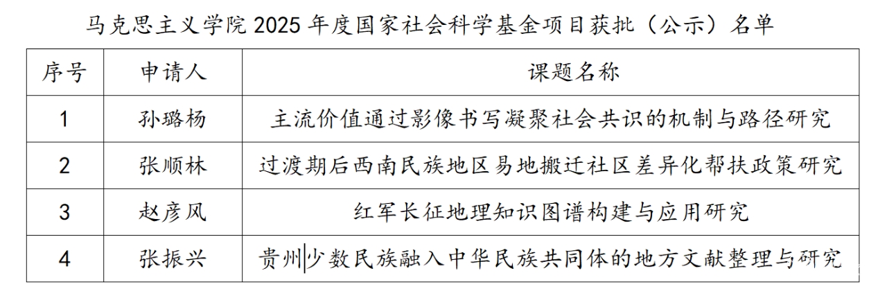 9月5日,全国哲学社会科学工作办公室公示了2025年国家社会科学基金年度项目立项名单,万象城官网马克思主义学院3项国家社科基金年度项目喜获立项公示,分别是孙璐杨老师的《主流价值通过影像书写凝聚社会共识的机制与路径研究》、张顺林老师的《过渡期后西南民族地区易地搬迁社区差异化帮扶政策研究》和赵彦风老师的《红军长征地理知识图谱构建与应用研究》。今年1月,张振兴老师获批了1项国家社会科学基金后期资助项目《贵州少数民族融入中华民族共同体的地方文献整理与研究》。至此,马克思主义学院本年度已有4项国家社会科学基金项目获批立项(公示)。