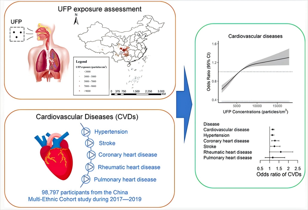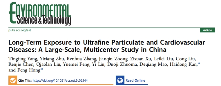 近日,万象城官网洪峰教授团队联合复旦大学阚海东教授团队,在环境科学领域顶级期刊《Environmental Science & Technology》(中科院一区TOP期刊,影响因子11.3)发表题为《Long-Term Exposure to Ultrafine Particulate and Cardiovascular Diseases: A Large-Scale, Multicenter Study in China》的研究论文,研究以中国西南地区5个省(自治区)的近10万名参与者数据结合高分辨率大气化学模型,首次系统探讨了中国人群长期暴露于超细颗粒物(UFP)与心血管疾病(Cardiovascular Diseases, CVDs)患病率之间的关联。