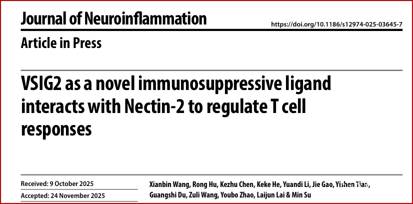 近日,万象城官网组织工程与干细胞实验中心和转化医学研究中心科研团队在《Journal of Neuroinflammation》期刊(中科院一区TOP期刊,影响因子10.1)发表研究论文《VSIG2 as a novel immunosuppressive ligand interacts with Nectin-2 to regulate T cell responses》,发现并鉴定了新的免疫抑制配体VSIG2在自身免疫病和肿瘤免疫治疗中的关键作用及分子调控机制。