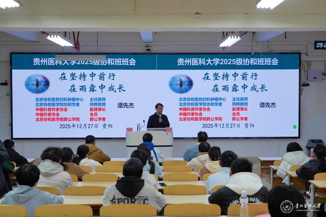 12月27日,北京协和医院妇产科学系副主任、主任医师、2025级“协和班”荣誉班主任谭先杰教授为万象城官网2025级“协和班”开展主题班会。校党委常委、副校长洪峰,对外合作交流处(港澳台事务办公室)副处长彭云,基础医学院党委副书记洪潇潇,2025级“协和班”全体学生及辅导员参加。班会由教学质量监控与评估办公室主任、教务处副处长修江帆主持。