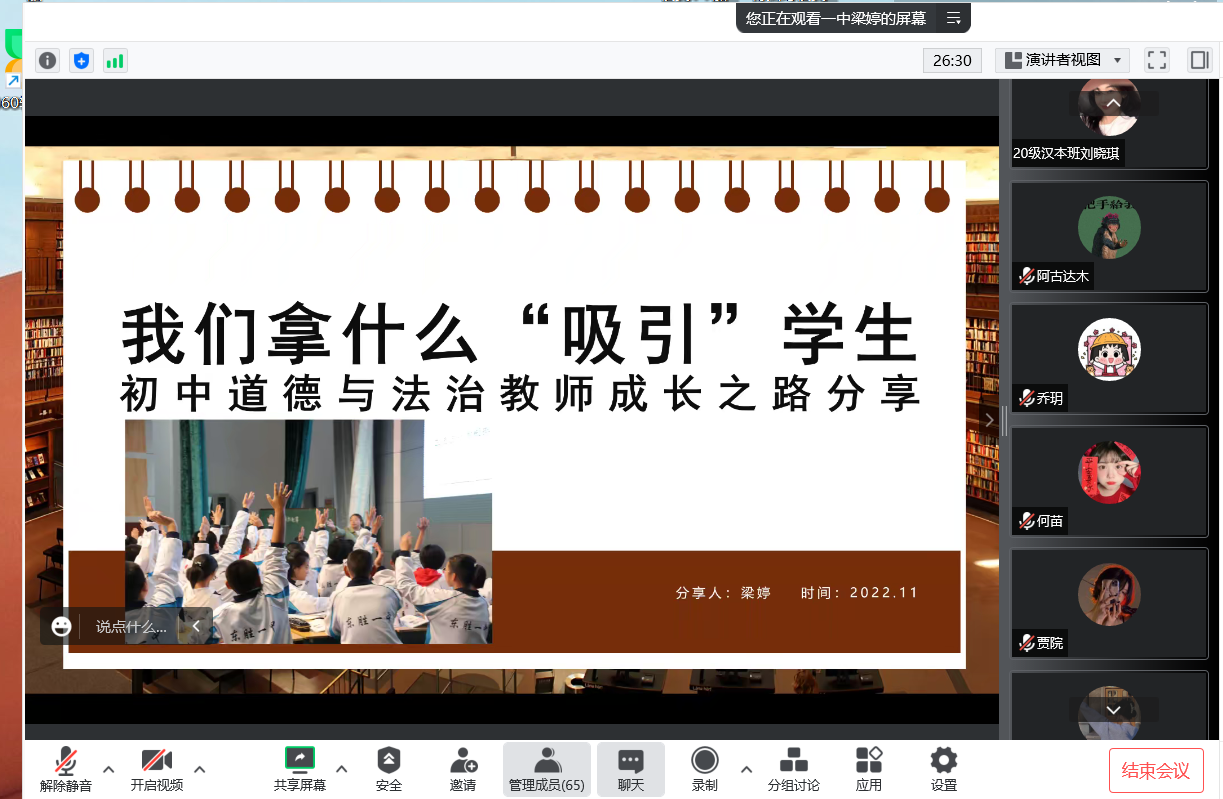 为了更好适应教育部师范类专业认证的新要求,进一步加强专业建设,11月5日,KY开元集团官网组织开展“中学政治教师素质养成”系列讲座的第二讲,邀请到鄂尔多斯市东胜区第一中学梁婷老师为学院学生作“初中道德与法治教师成长之路分享”线上主题讲座。讲座由学院吴娇老师主持,学院全体学生在线参加。